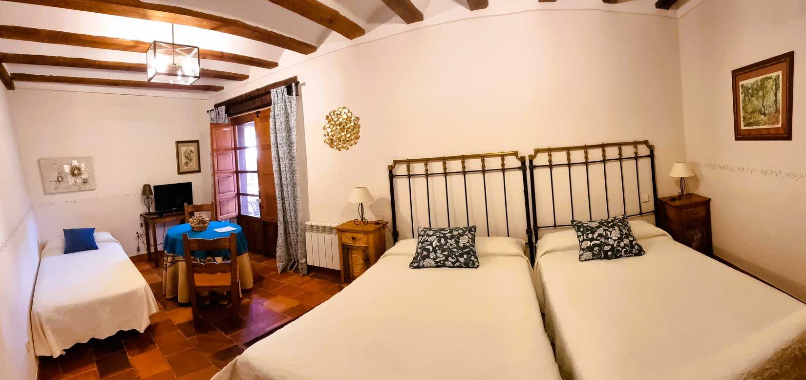 El hotel rural ofrece al visitante distintos tipos de habitaciones: individuales, dobles, triple y cuádruple. En todos los casos están dotadas de baño propio y equipadas con secador de pelo, TV de pantalla plana, wifi, productos de acogida y toallas y lencería de cama.